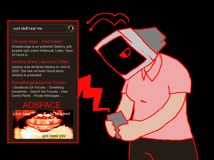Every browser kind of just sucks when you're using a Hellphone, you guess. Only one of these results is relevant at all. The rest are just weirdly targeted or some complete nonsense that means utterly nothing. Or ads. You wonder if anyone's made an extension that makes this at all usable. > That kind dog says it will save you, click on the useful ad! |
